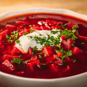 Enjoy vibrant Borscht made from scratch, full of fresh vegetables and classic flavours, perfect for a nourishing meal any time.