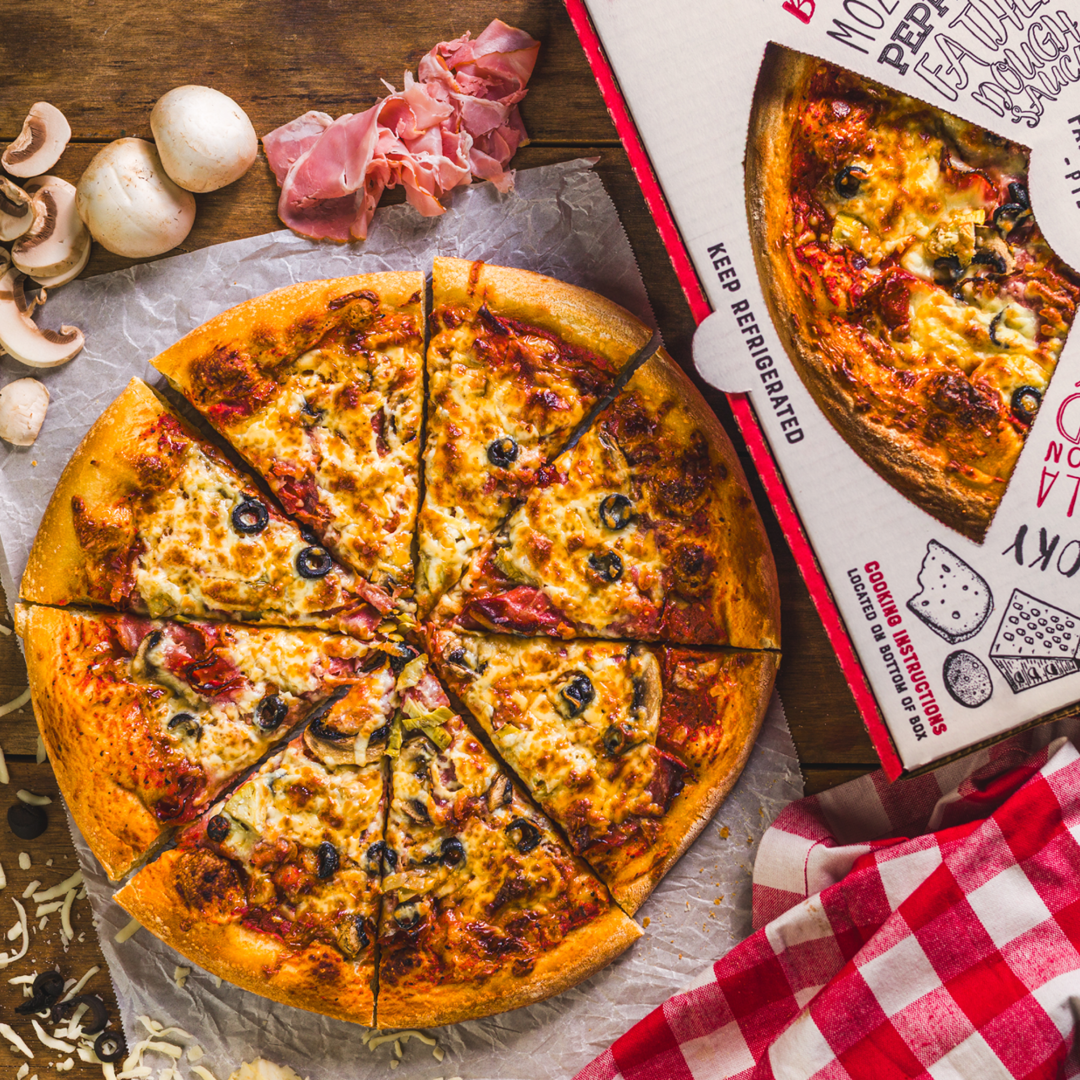 Our Truffled Mushroom Pizza boasts a garlic and herb-infused base, topped with tender mushrooms, creamy mozzarella, and a generous sprinkle of Grana Padano. Finished with a drizzle of rich truffle oil, it’s the perfect gourmet indulgence for a cozy night in!