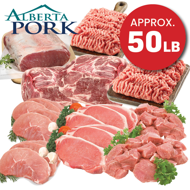 0.8kg Alberta Pork Tenderloin, 2kg Alberta Chicken Boneless Skinless Breasts (Individually Quick Frozen), 0.8kg Alberta Chicken Extra Lean Ground